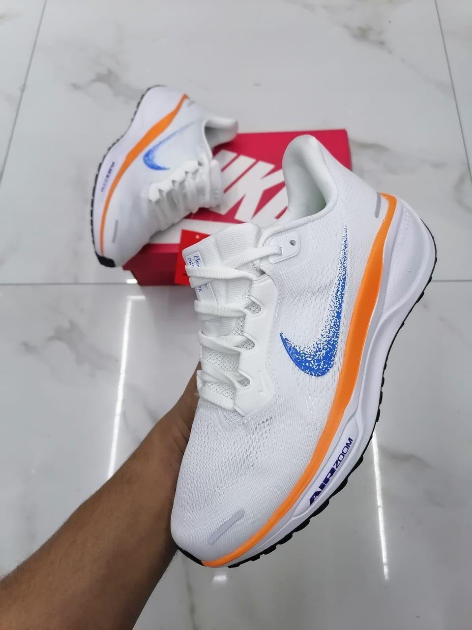 These Nike Air Zoom running shoes combine sleek design with performance-driven technology. The upper is crafted from lightweight, breathable white mesh that ensures excellent airflow for comfort during runs. A gradient blue Nike Swoosh adds a dynamic visual touch, contrasting sharply against the clean white base.