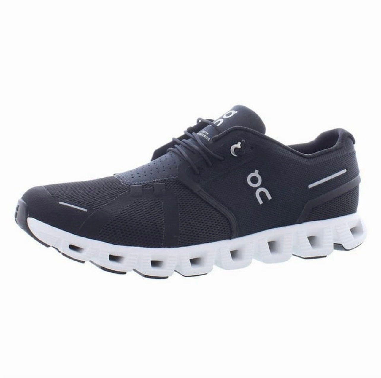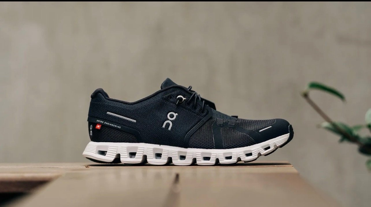 The shoe in the image is an On Running Cloud sneaker by On, a Swiss athletic brand. It features their signature CloudTec®️ sole with hollow pods for cushioning and energy return. This specific model appears to be the On Cloud 5 in Black/White — a lightweight, breathable, everyday running and casual shoe.